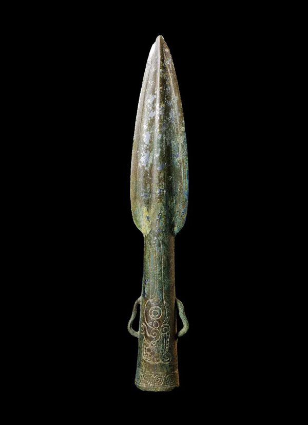 矛是古代的刺杀兵器,是古代军队中大量装备和使用时间最长的冷兵器之一。此器是典型的战国时期巴蜀铜矛,矛骹部两边的弓形耳、骹上装饰的巴蜀符号,都显示出鲜明的巴蜀血统。
