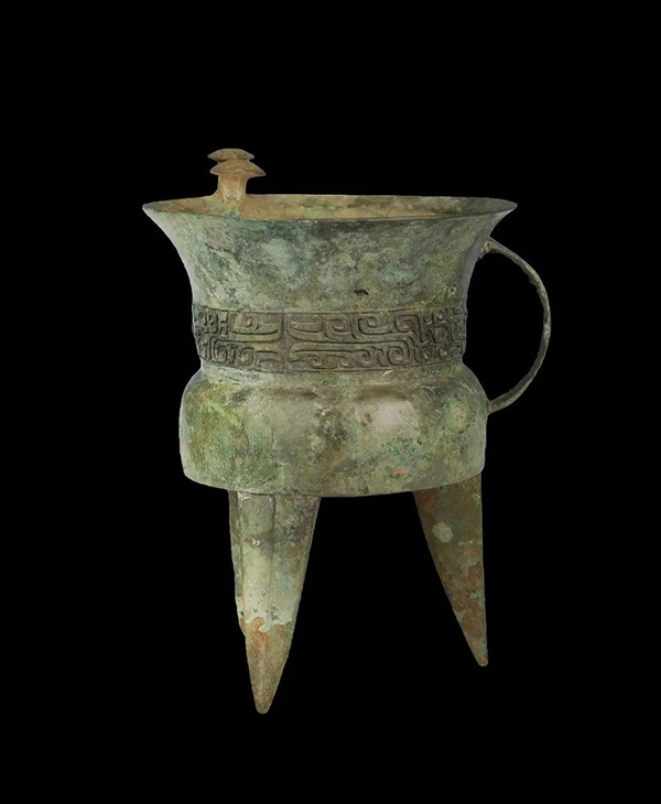 斝为盛酒器,也可温酒,商代盛行,多为王室和具有一定等级的贵族所用。此器只装饰有一条饕餮纹带,单层无底纹,是典型的商代早期装饰风格。李家嘴 1 号墓是一处高等级墓地,1974 年当地筑堤取土时被发现,虽然已遭破坏,但是随葬品极为丰富,其中酒器有 4 觚、3 爵、5 斝、1 壶、2 尊,从觚爵斝的套数来看,墓主人无疑是当时盘龙城的最高首领。