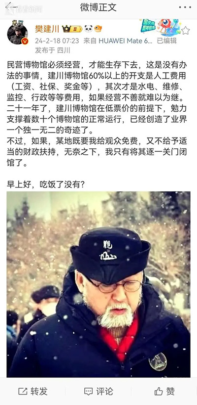 2月18日,建川博物馆馆长樊建川在个人自媒体平台发文称:“民营博物馆必须经营,才能生存下去,这是没有办法的事情,建川博物馆60%以上的开支是人工费用(工资、社保、奖金等),其次才是水电、维修、监控、行政等等费用,如果经营不善就难以为继。”
