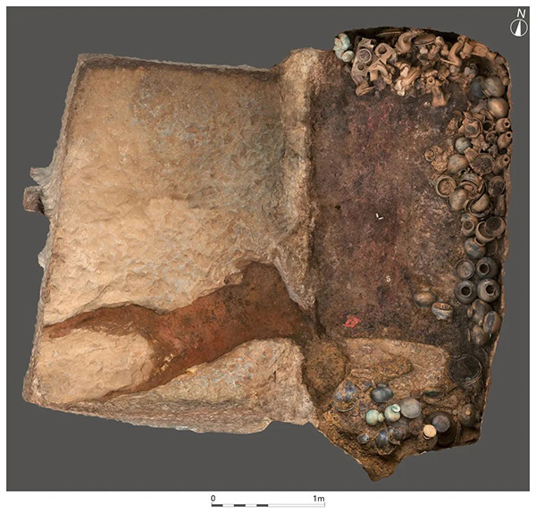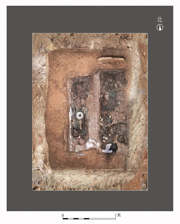 2.Ⅲ区西侧揭露1处楚王夫人墓地。该墓地距离驮篮山楚王墓北侧约200-400米区间范围内,墓葬形制主要分为两种,竖穴石坑墓和竖穴石坑洞室墓。其中有4座未开凿完成墓葬为M2、M8、M11、M13;竖穴石坑洞室墓7座,有M1、M3、M4、M7、M9、M10、M12;竖穴石坑墓4座,分别为M5、M6、M14、M15。从出土文物组合及形制来看,墓葬时代从西汉早期延续至西汉中期,墓葬均为单人葬,头向南,朝向楚王墓。通过对随葬品及人骨形态分析,确认部分墓主为女性个体。