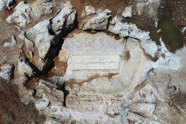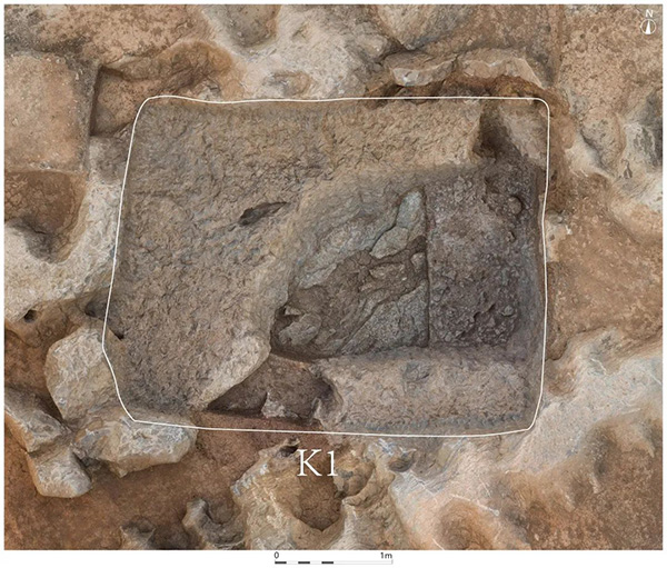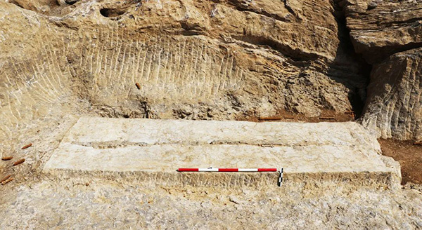3.Ⅰ区和Ⅲ区均发现的汉代采石遗存,Ⅰ区和Ⅲ区发现多处采石楔窝,据其形制观察,为典型汉代开凿方式,应为开采小型石材的孑遗(图十四)。Ⅲ区内共揭露5座石坑遗迹,其中K1-K4位于地块西南角,典型的汉代开凿方式,且均未开凿完成。根据其所处位置及形制结构,推测或因特殊历史事件导致未开凿完成(图十五)。K5位于地块东侧,为一处开采塞石的采石坑,东距驮篮山楚王墓275米。从其形制与既往资料对比分析来看,为典型的汉代采石工艺,出土一整套开采工具,如铁凿、铁錾、铁斧、磨石等,为研究汉代采石工艺提供重要的材料。采石坑内塞石尺寸与驮篮山楚王(后)墓中使用塞石基本一致(图十六、十七)。由此可证驮篮山楚王(后)墓内使用塞石,应来源于墓葬周围山体区域。