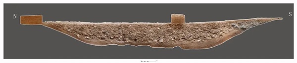 4.驮篮山楚王(后)墓开凿时废弃的碎石堆积坑。碎石堆积区位于Ⅰ区北侧,西南角距离楚王墓约187米。碎石堆积坑大致呈椭圆形,剖面为锅底状,东西跨度约28、南北宽约23米,深度约1.7米。坑内堆积有大量碎石块,部分石块可以看出明显的凿痕,石渣内夹杂少量碎陶片及铁质工具等。根据其分布范围及堆积情况,初步判断为开凿楚王(后)墓废弃的碎石渣遗存(图十七)。