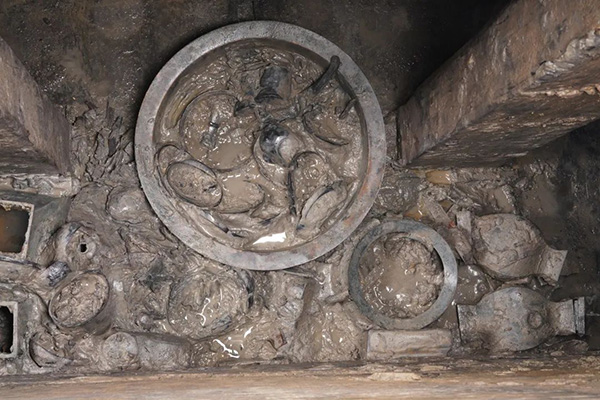 (五)关口一号墓是西汉初期等级制度确立的见证。该墓尺寸大小、棺内头厢和边厢数量均体现了典型的西汉中型墓葬的特征,其官秩六百石而不授印也与规制相合。墓中出土漆扁壶、漆圆壶、铜釜、铜钫、铜灯等均为两套。出土舆车及手持剑、戈、盾等兵器的护卫俑与散落至边厢的骑马俑等形成一整套墓主出行仪仗。西汉的丧葬制度在惠帝和吕后时期得到了完善,关口一号墓严格执行了这样一套制度。