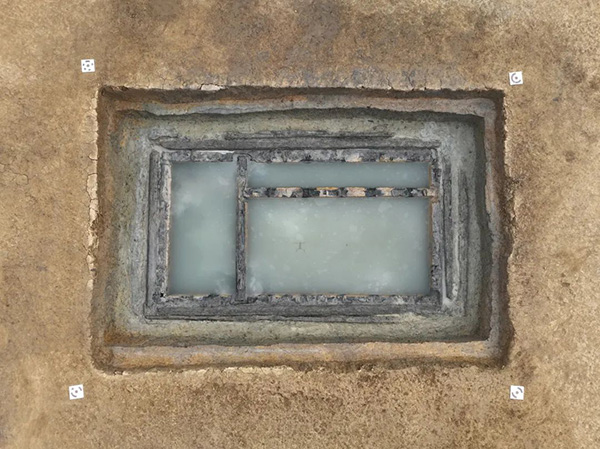 关口一号墓为长方形竖穴土坑木椁墓,方向81°。建造方式为先挖竖穴墓圹,墓圹内置木椁,后于木椁顶部及四周包裹白膏泥。墓圹长6.50、宽4.25—4.30、距现地表深4.13—4.78米。由于墓内常年处于满水状态,且未被盗扰破坏,故椁室、木棺及随葬品均保存较好。