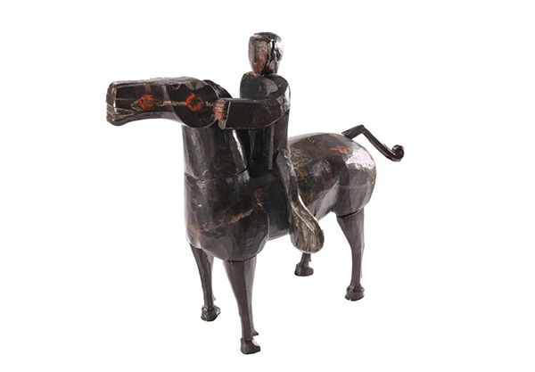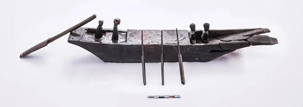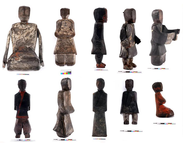 棺室内共出土遗物以模型明器为主,包括人物俑、动物俑、木船、木戈、木槊、木剑、木盾等。其中人物俑可分为立俑和坐俑。大型俑高约25厘米,小型俑高约8厘米,俑头和俑身大多以整木雕刻成型,手部及足部则以榫卯结构与俑身相连,面部轮廓以墨、漆勾勒,通过对遣策识读可知人物俑身份不仅有奴仆,还有墓主亲属等,在考古发现中尚属少见。