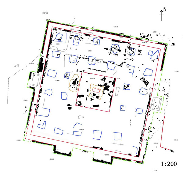 图三 香山寺遗址布方总图(标红线探方为2016-2021年发掘点,蓝色框线为2023年度发掘)