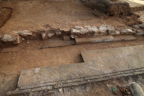 图十六 2023年发掘的殿基西端条石基础和东端的斜坡状条石遗迹及砖瓦堆积