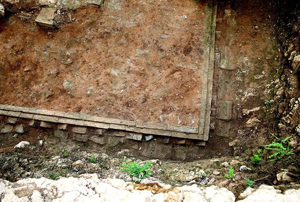 晚期建筑由地上夯土台基和附属设施组成。夯土台基居砖构遗存周围,夯土包裹砖构遗存100厘米深。台基表面清理出环绕中部塔基的26个磉墩遗迹,已残,其内外两重、每面6个,对称分布,个别有碎石块(图十二)。台基周围以条砖和石块垒砌形成包边(图十三)。西北角斩山而成,并利用山岩一部分作为台基包边。台基外东、西侧近中部各有一长方形踏道(图十四),南侧中部有左右对称的长方形双踏道,北侧近山体而无踏道。台基南侧的双踏道间隔数米,单个踏道宽390厘米、南北进深290厘米。台基包边外侧残存散水一圈,宽100~115厘米,部分地面方砖铺砌、磨砖对缝。散水外沿由两排条砖并排侧立包边,外侧再用牙砖固定(图十五)。据柱网结构,推断晚期台基上建有一木构建筑。