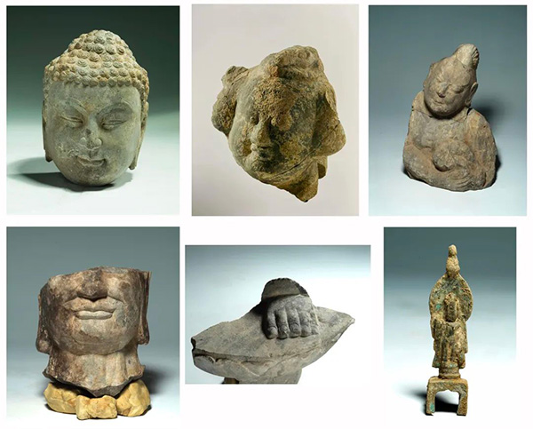 图十九 考古出土遗物(石刻造像、鎏金菩萨像)