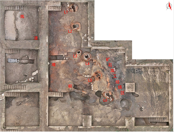 炼炉,共发现6座,坐东朝西,利用山前缓坡修建而成,其炉体、金门、鼓风口等结构清晰、保存较好。根据炼炉形制大小,可分为两类:大型炼炉,发现5座,分别为L1、L2、L4、L5、L6;小型炼炉,发现1座,为L3。现以L2为例进行介绍:L2,位于发掘区北部,方向262°。炉体平面呈椭圆形,外径长2.7、宽2、残高1.77米;内径边长0.7、残高1.35米。炉壁厚约0.2米,炉底可见锈黄色炼渣。鼓风口有两个,长0.45、宽0.25米,内有带凹槽的半圆形石质鼓风构件,凹槽直径约0.1米。金门位于炉体西侧,与炉底相通,高约0.4米。金门向西延伸发现有黑灰色活动面,略向外倾斜。