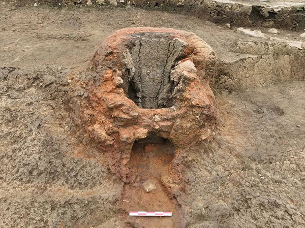 炼渣堆积区,位于发掘区西部。揭露部分长25.65、宽21.9米,堆积东薄西厚,最深处可达1.5米。从解剖情况看,炼渣堆积局部可划分为17层,多为炼渣与垫土层层叠压交织且不断垫平,应与炼炉长期频繁的冶炼活动有关。