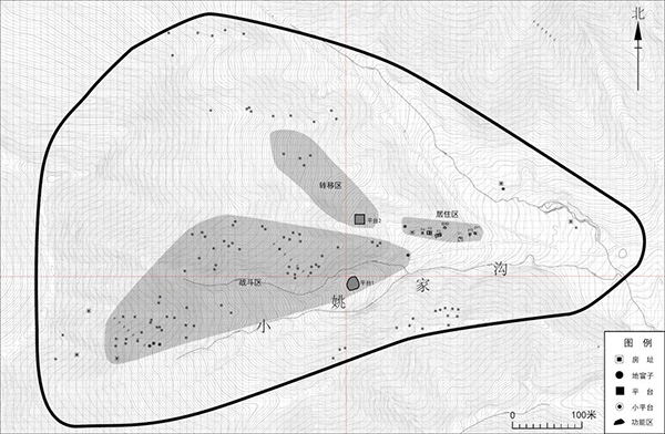 以小姚家沟遗址为例,遗迹按照功能和在沟谷内的分布大体可分为居住区、转移区和战斗区(图五)。居住区为沟口内西侧向阳缓坡区域,主要分布遗迹类型为半地穴式的地窨子、带有石砌火坑的房址;战斗区位于居住区南侧东、西两条岔沟之间及西侧岔沟的阳坡上,这一区域最外侧分布有大型室外平台,近山顶的坡上错落分布大量战斗工事;转移区位于居住区西侧,沿缓坡向上分布有一处大型室外平台,向上翻过山脊可通往红石砬子抗日游击根据地遗址群内其它区域。整体形成了沟口防御、谷内居住转移的军事格局。