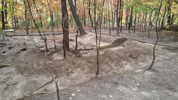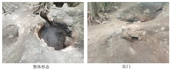 红石砬子遗址地窨子按有无火墙可分两类,带火墙的地窨子为圆形半地穴式建筑,一般带有室外灶(图六),有的无灶圈(图七),灶门火口与地窨子内壁环形火墙相通,灶口对面设有烟囱向外排烟,室内地面上有长条形凹坑抽烟洞,与烟囱根部相连利于燃烧,一般为谷口岗哨,可供临时居住;无火墙的地窨子一般为圆形半地穴岗哨,专作警戒之用(图八)。