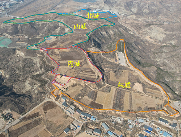 杨家城城址西濒黄河一级支流——窟野河,所在区域为典型的黄土梁峁地貌,地表割裂较甚,起伏颇大,顶部黄土堆积厚,底部出露基岩高。与陕北地区明代以前的多数城址选址相同,杨家城城址临河呈高悬之姿,在山顶依地势而建,西、北两面紧濒窟野河,高崖陡壁,东为大沟,易守难攻,仅南部与外界较易相通。城址所在区域相对独立,整体较为平整开阔。据原有资料,城墙多夯土筑成,主要由东城、内城(俗称“紫锦城”)、西城3座小城组成,整体呈不规则长条形分布。在以往工作基础上,本次考古工作新发现“北城”一座,城墙走向清晰,城内所见遗物多为宋金时期,应与已发现的3座小城大致同期。故此,目前所知杨家城由东城、内城、西城、北城4座既相对独立又相互联系的小城组成,城内面积约70万平方米。4座城垣均系黄土夯筑,但非一体而成,其中东城城垣依附内城城垣向东扩筑的关系最为明显。另据调查勘探,城南设有护城壕,还发现窑场、墓地等重要功能区。