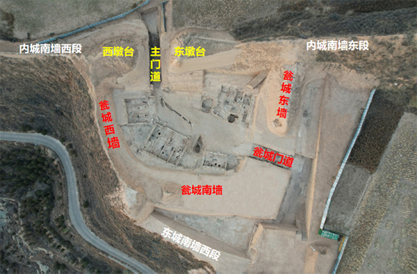 本次考古工作的发掘重点选定在破坏现象非常突出的内城南门区域。内城平面结构相对规整,略呈平行四边形。内城南门位于内城西南部,结构清晰、保存较好,以下分为主门道、墩台、瓮城、瓮城门道、瓮城内建筑群、储排水设施等部分依次介绍。