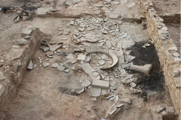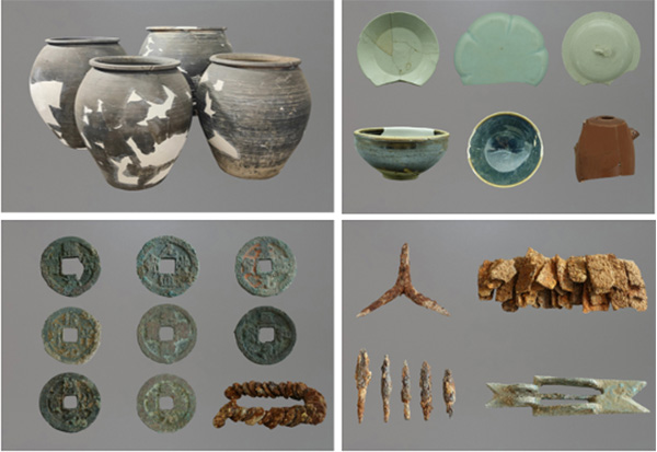 需要着重介绍的是瓮城内的建筑群和储排水设施,本次考古工作出土遗物主要发现于这些遗迹中。内城南门瓮城内四角各坐落一组建筑,呈向心型分布,均背靠城墙,朝向瓮城内开门。四组建筑外墙主体均为砖石砌筑,墙体内有柱洞和壁柱槽。每组建筑内部以小石块、砖瓦或夯土墙分隔出若干小房间。房间内有石板“炕”、灶、窖穴、地炉等生活设施,居住面上散落陶器、瓷器、石磨、石臼、钱币以及兵器等遗物。如1号建筑整体平面呈长方形,门道朝南,南北长10.15米、东西宽11.5米,总面积约117平方米。内部以土坯墙或小石块砌墙分隔出7个小房间,房间内多见石板炕和灶台,已使用煤炭燃料。另外,瓮城内还发现了由导水沟、储水坑等设施构成的储排水设施。其中1号导水沟位于瓮城中部地势最低洼处,东南—西北向经主门道地下延伸进内城,将瓮城内的积水引入内城中。