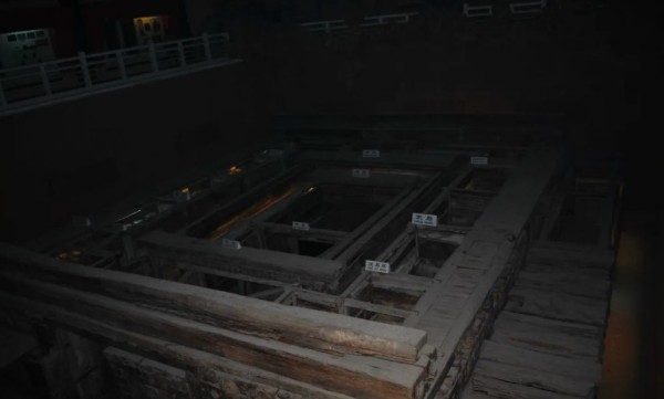 广陵王墓中的“黄肠题凑”全部构件采用金丝楠木,其木梓面积比湖南马王堆汉墓大18倍,共有856块,每块题凑大小尺寸都不相同,四面企口高低错落有序,全凭榫卯相连。