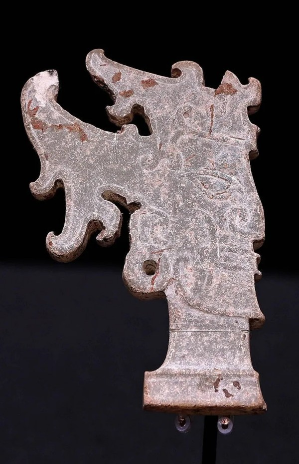 这件玉凤是2023年七星墩遗址考古的新发现,石家河先人将凤鸟收合短翅侧身回首的瞬间刻在了这块透闪石软玉上,他们用减地雕刻法(一种特殊的浮雕)绘出凤鸟周身的羽毛,用透雕表现凤鸟繁复的羽冠和较短的尾羽,又在凤尾底端打了一个孔方便穿绳佩戴。