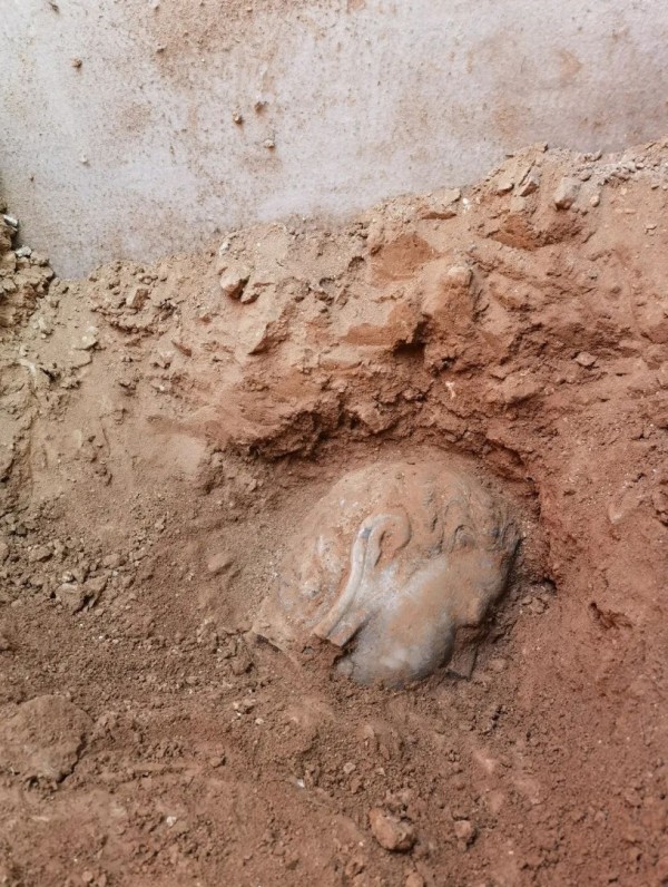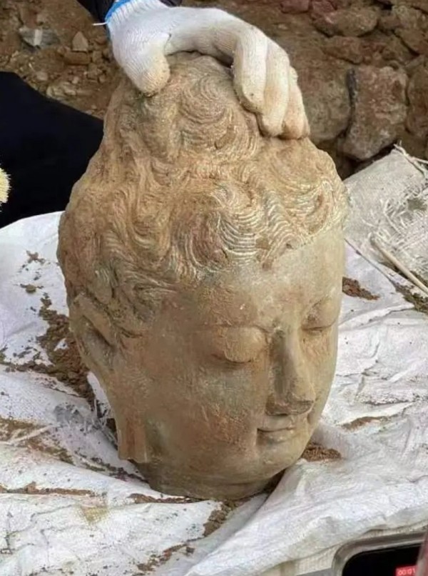 其中一件圆雕佛头,出土于前壁西南角近南墙的地表面下40厘米处,上部为坚硬的料礓石堆积,头像保存完整,高38厘米、宽22厘米、厚19厘米,头顶有高肉髻,肉髻和发髻表面饰品字形水涡纹,头两侧和后部发纹雕刻波浪状起伏,面相丰满圆润,长眉细目,眼睑微启,直鼻,鼻尖稍残,双唇饱满,曲线柔和,神态恬静祥和,下颌圆润,颌下有内凹弧线,整个头像雕刻精美,具有鲜明的龙门盛唐造像风格,判断时代为7世纪晚期至8世纪初。