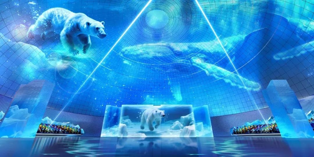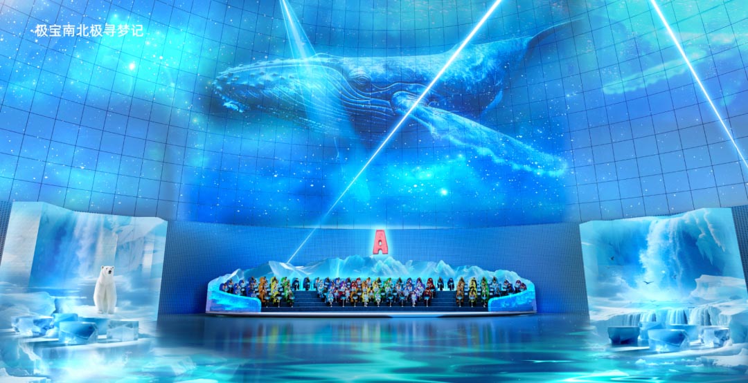 “极宝的家”模拟极地科考家庭场景,通过知识问答打造南北极10 万个为什么:“极宝爷爷的工作站”复原中国极地科考先驱的工作场景,重现1984年长城站建站历程与中国41年波澜壮阔的极地科考辉煌成就。探索中心展项裸眼 3D 大屏以双主角跨代际探险故事,串联穹顶巨幕空间从宇宙起源到南北极形成、从单细胞诞生到极地生命繁衍、从生态破坏到唤醒环保意识、从人类觉醒到地球万物繁荣等大世界观主题穿越叙事,将极光、冰川、动物、地质变迁等丰富元素深度融入,实现南北极联通的超现实构想。