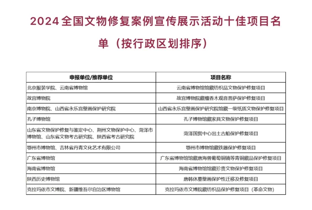 2024全国文物修复案例宣传展示活动十佳项目名单