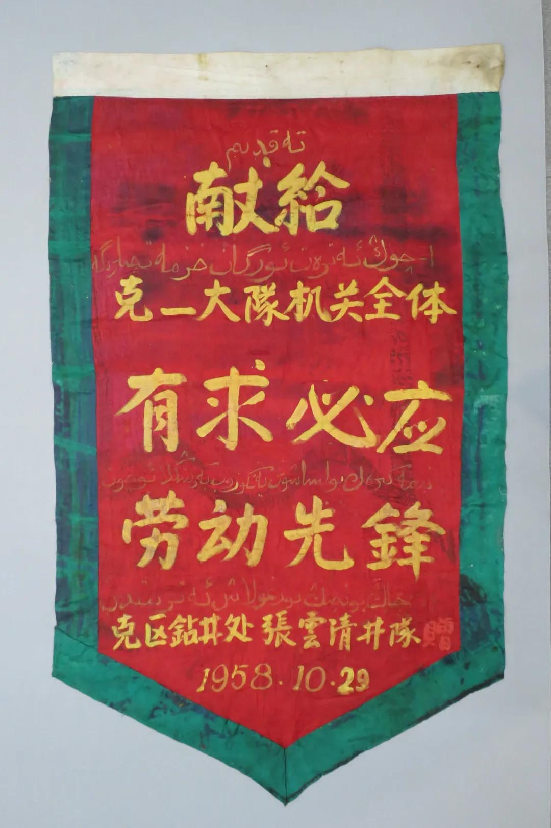 新疆博物馆在本次项目中共保护修复珍贵纺织品文物10件,其中二级文物2件、三级文物8件,文物年代在1956年至1960年,均为我国建国初期的中国石油工业开拓性发展关键时期的革命文物——锦旗。这批锦旗内容丰富,生动展示了克拉玛依油田的辉煌历史和新中国石油工业的崛起历程。
