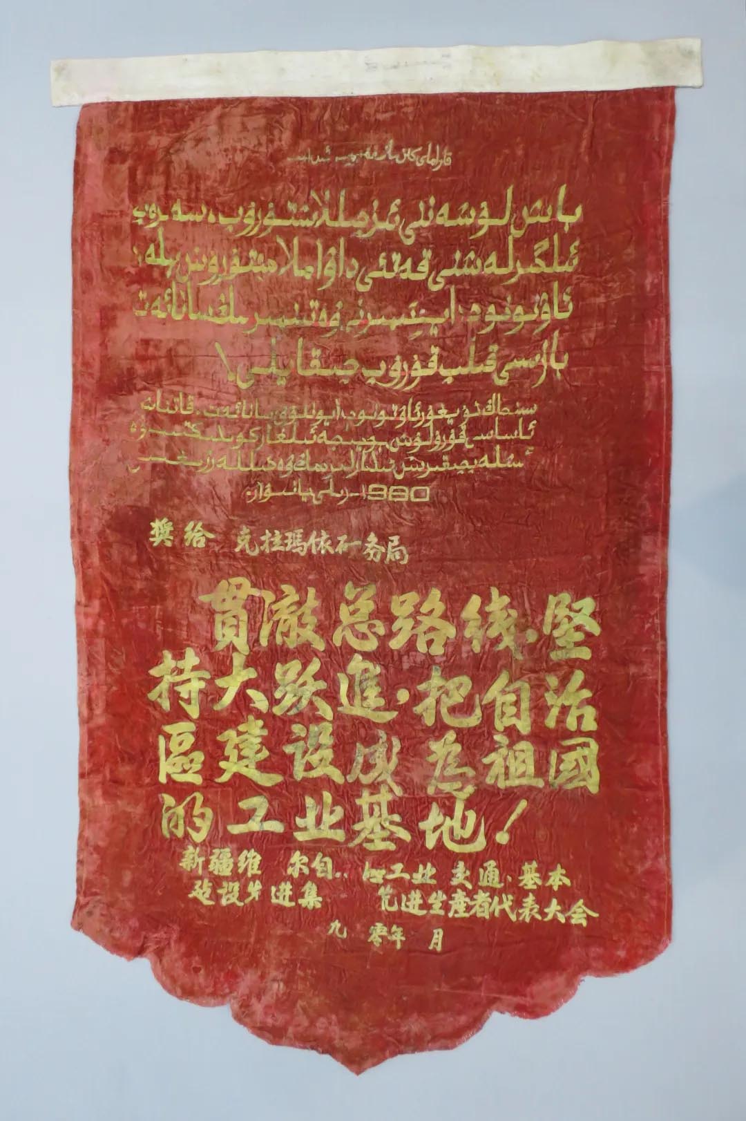 从锦旗文字中可以看出新中国成立初期,来自全国各地的中国石油建设者进疆勘探,身体力行扎根边疆、投身荒漠、克服困难、艰苦创业,为新疆经济发展和社会稳定以及促进各民族交往交流交融作出了积极贡献。