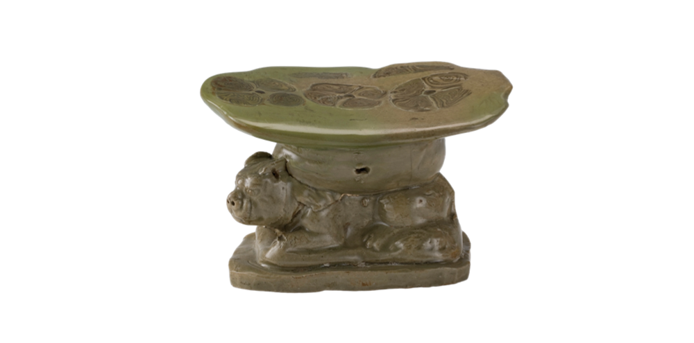 越窑青釉绞胎灵芝纹伏兽瓷脉枕