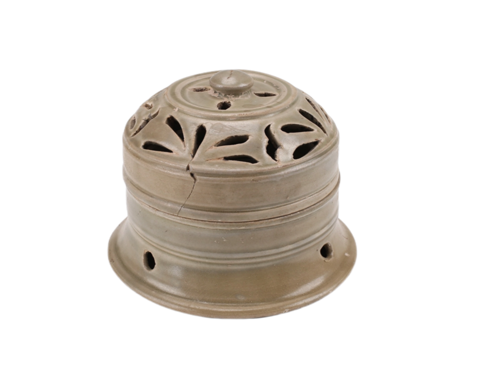 唐代香具。由盖与器身两部分组成,子母口。盖隆起,上平顶,顶置一宝珠纽。器身浅腹,直壁,圈足外撇。盖面镂空花纹,并间以凸弦纹;器外壁饰两周凸弦纹,圈足外镂三圆孔。青灰色胎,细腻轻薄,满施青釉,釉呈青灰色。圈足内有六个支烧痕迹。整器造型玲珑秀美。