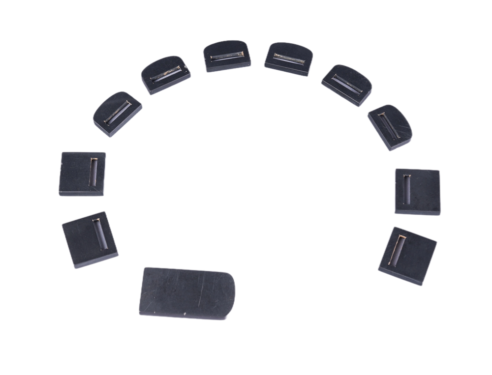 石质如墨玉,共11片。规格分三种,厚度大致相同:方銙4片,半圆形銙6片,铊尾1片。方銙和半圆形銙有双面长形孔。每块玉片表面光素无纹,背面皆凿有线孔,孔内留有金属丝线断迹。