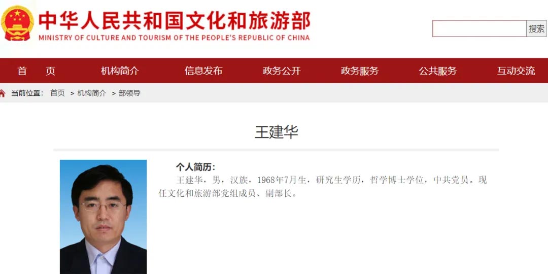 文旅部官网介绍:王建华,1968年7月生,研究生学历,哲学博士学位,中共党员。