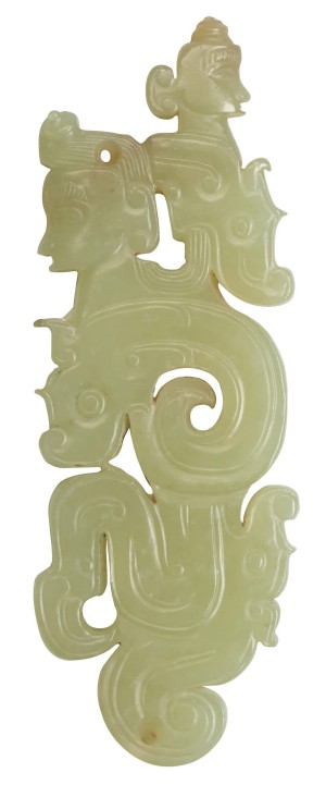 西周时期 西周时期,龙纹在继承商时期风格的基础上又有了新的变化。龙纹是西周玉器上的重要装饰题材,西周时期龙纹玉器多为片状,作为佩饰的组成部分,在仪式场合穿戴佩挂。其中精美者如人龙合体纹饰佩(图4),利用圆弧曲线和琢磨成坡面的斜刀技巧,形成华丽流畅的视觉效果。人与龙相融合的主题,其用意在于表达人龙合一的神性。
