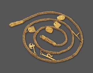 尽管这一时期战乱频繁,社会生活遭到了严重破坏,但多元的思想文化尤其是佛教的影响为龙的形象加入了新的因素。内蒙古包头市达茂旗西河子出土一件金龙形项饰(图9),龙身用金丝编缀成绞索式,缀有两盾、两戟和一钺,两端各有一金片卷制的龙头,龙角以金丝缠绕。这件形似璎珞的项饰即为“五兵佩”,在魏晋时期流行,《晋书·五行志》说:“惠帝元康中,妇人之饰有五兵佩,又以金银玳瑁之属,为斧钺戈戟,以当笄。”这件项饰混合了斯基泰、犍陀罗等诸种工艺手法,反映了当时多元文化相互交融的历史风貌。