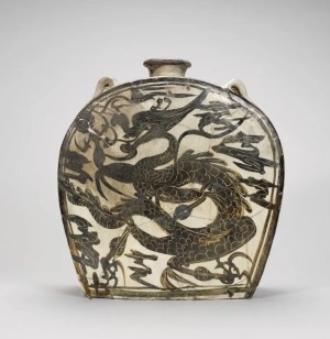 元代的龙纹与宋代较为相似,身形较细长,原来长着象征性羽翼的位置,已被宛曲多叉的火焰纹替代,有的龙尾添上尾鳍,风格简洁古朴。元代的龙纹应用广泛,尤其在瓷器上得到了淋漓尽致的表现。以青花瓷器为代表,其上绘制的龙纹色彩鲜艳丰富,层次分明,生动传神。内蒙古赤峰市林西县发现的青花龙纹高足杯和青花龙纹盘,细颈三爪,身形流畅,鳞片细腻,与周围的草叶纹、缠枝纹、云纹相得益彰,使画面更为丰富。北京元大都遗址出土有一件白地黑花龙凤纹瓷扁壶(图13),白地黑花是宋元时期北方地区流行的瓷器品种,扁壶的造型又兼具草原民族特征。此时龙的等级含义也被进一步加强,元代的统治者对龙的使用进行了限制,双角五爪的龙成为皇权的象征。