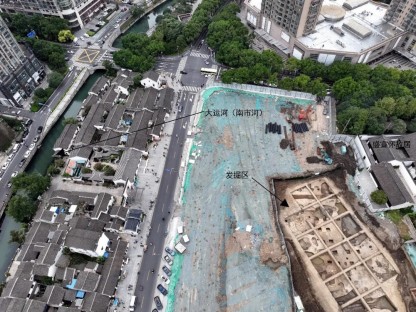 茭蒲巷遗址位于江苏省常州市钟楼区南大街街道茭蒲巷社区,大运河(南市河)与古城中轴的交汇处(图一)。为配合基本建设,经国家文物局批准,常州市考古研究所对遗址进行了考古发掘。由于地块内大部分区域被现代地下室和管线设施破坏,实际发掘面积约3000平方米(图二)。遗址地处常州古城核心区,周边分布有青果巷历史文化街区、南市河历史文化街区、大运河常州城区段、盛宣怀故居等文物遗存(图三)。根据文献记载,遗址周边历史上还分布有毗陵驿、烈帝庙、张王庙、真武庙、江东祠、荆溪馆、武进县医学等古迹,是一城繁华之所在。