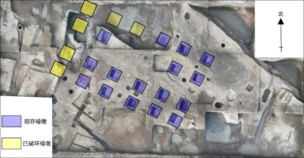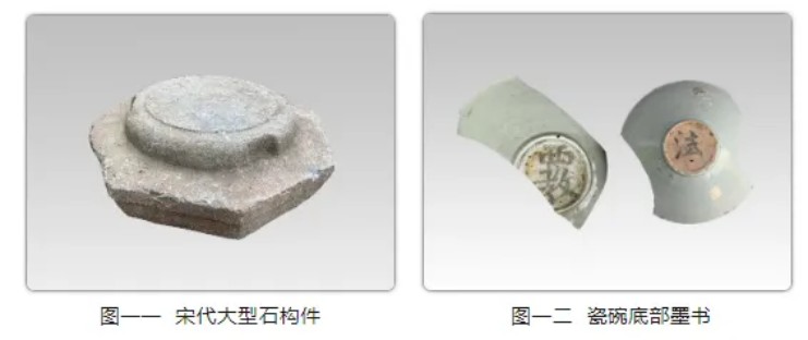 清理宋代大型建筑基址两处,一处位于发掘区东部,由7个方形磉墩组成,平面呈长方形,大部延伸至发掘区外,残长15.2、宽4米,根据其分布位置和形制特点,可能与历史上常州城内的烈帝庙祖庙有关。另一组相对完整,为三进五开间的大型建筑(图九),面向古运河,平面近长方形,中部存在“减柱”现象,东西长约25、南北宽约17.5米,残存16个方形磉墩,由碎石和纯净的黄土层层夯筑而成(图十)。根据建筑形制和规模,以及出土的大型石构件、器底墨书“西教”“法”等内容的瓷器等(图一一、一二),推测与宋代常州城内的驻军教场或法济寺等官式建筑有关。