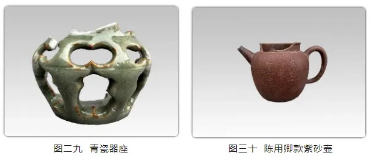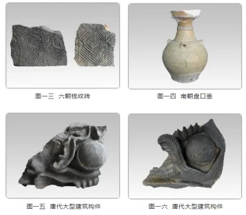 茭蒲巷遗址出土春秋至明清时期文物五百余件(套),包括瓷器、陶器、金属器、漆木器、骨角器和石器等。虽未发现春秋时期文化层或遗迹,但部分灰沟底部出土石锛、印纹硬陶残片等,表明先秦时期已经有人类在此活动。汉、六朝时期遗物包括陶质排水管、钱纹砖(图一三)、盘口壶(图一四)等。唐、五代时期遗物主要出土于城壕内,以瓷器为主,窑口众多,包括巩县窑蓝彩碗、长沙窑瓷杯、越窑青瓷罐、秘色瓷盘等,此外还有大量本地宜溧窑生产的青瓷碗、钵、盏、杯等日用器。陶器数量较多,以各类建筑构件为主,包括大型建筑的瓦作构件、花纹砖以及莲花纹瓦当,表明周边可能存在有高等级建筑(图一五至二五)。此外,城壕内还出土大量动物骨骼、铜钱以及少量漆木器,铜钱以开元通宝和乾元重宝为主,还有少量唐国通宝。宋代遗物以瓷器为主,窑口众多,可辨有景德镇窑、龙泉窑、吉州窑、建窑等,部分瓷碗口沿处用银包边。陶器包括各类建筑构件如脊兽、瓦当、滴水等,还发现有大量礌石、建筑倒塌堆积和人骨等,可能与宋末“常州保卫战”有关(图二六至二九)。明清时期遗物以各类青花瓷器为主,还出土明末紫砂名家陈用卿款的紫砂壶一件(图三十)。