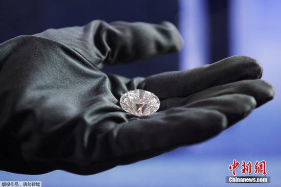 当地时间2017年8月1日,俄罗斯莫斯科,钻石生产商Alrosa公司展示从179克拉原石切割打磨出的钻石,51.38克拉的“王朝”钻石。