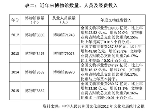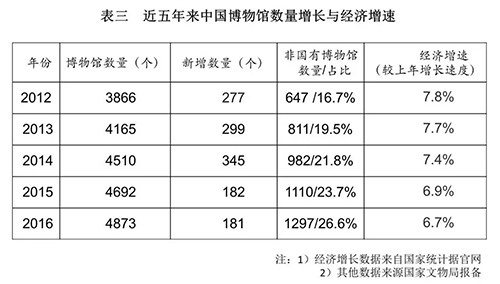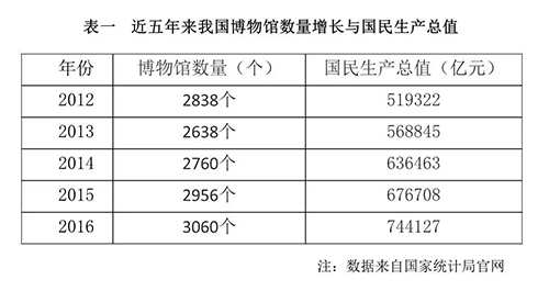 此外,通过2012年-2016年这五年的博物馆数量增长与国民生产总值的实际数据,2012年-2015年四年的博物馆数量、从业人员数量、年度文物经费投入比例的对比,并结合2012年-2016年博物馆数量增长与经济增速,分析博物馆与经济发展之间的关系,指出两者逐步走向融合,出现了博物馆与经济发展的利益共同体。