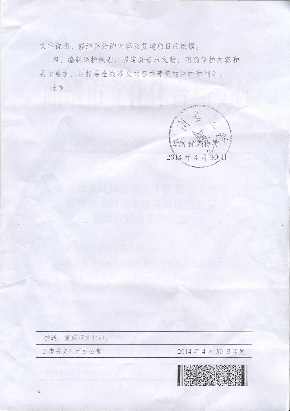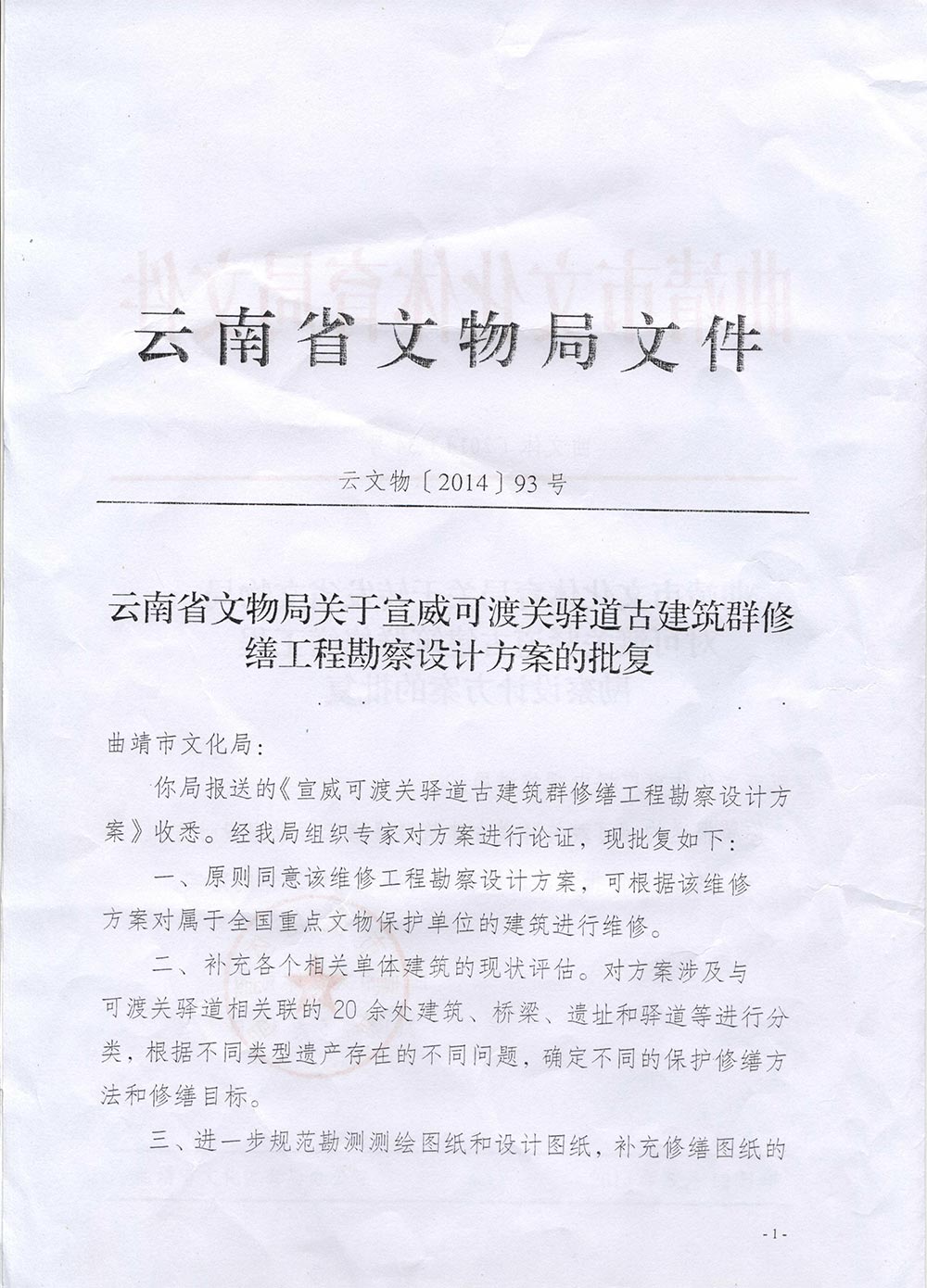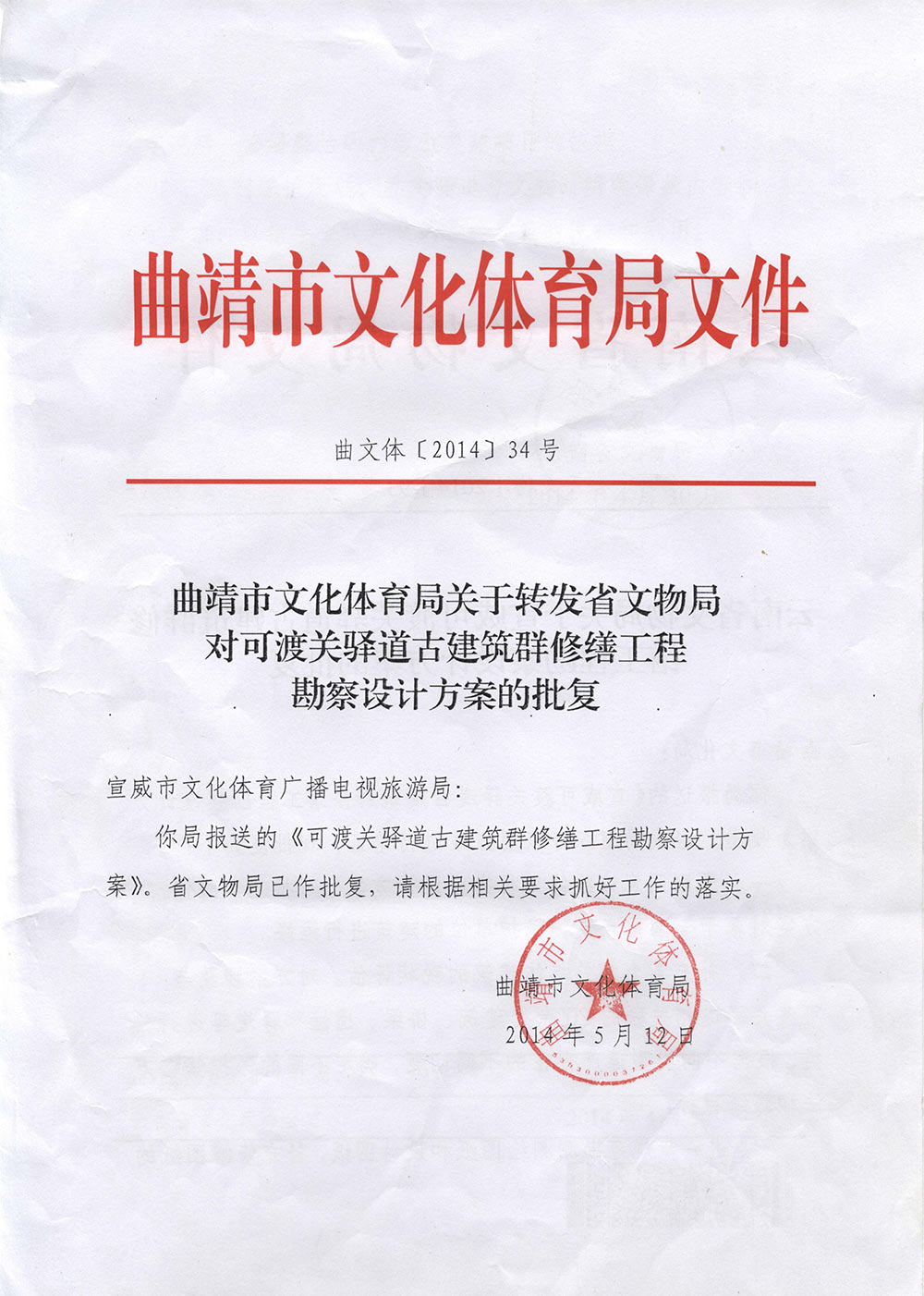曲靖市文化体育局关于转发省文物局对可渡关驿道古建筑群修复方案