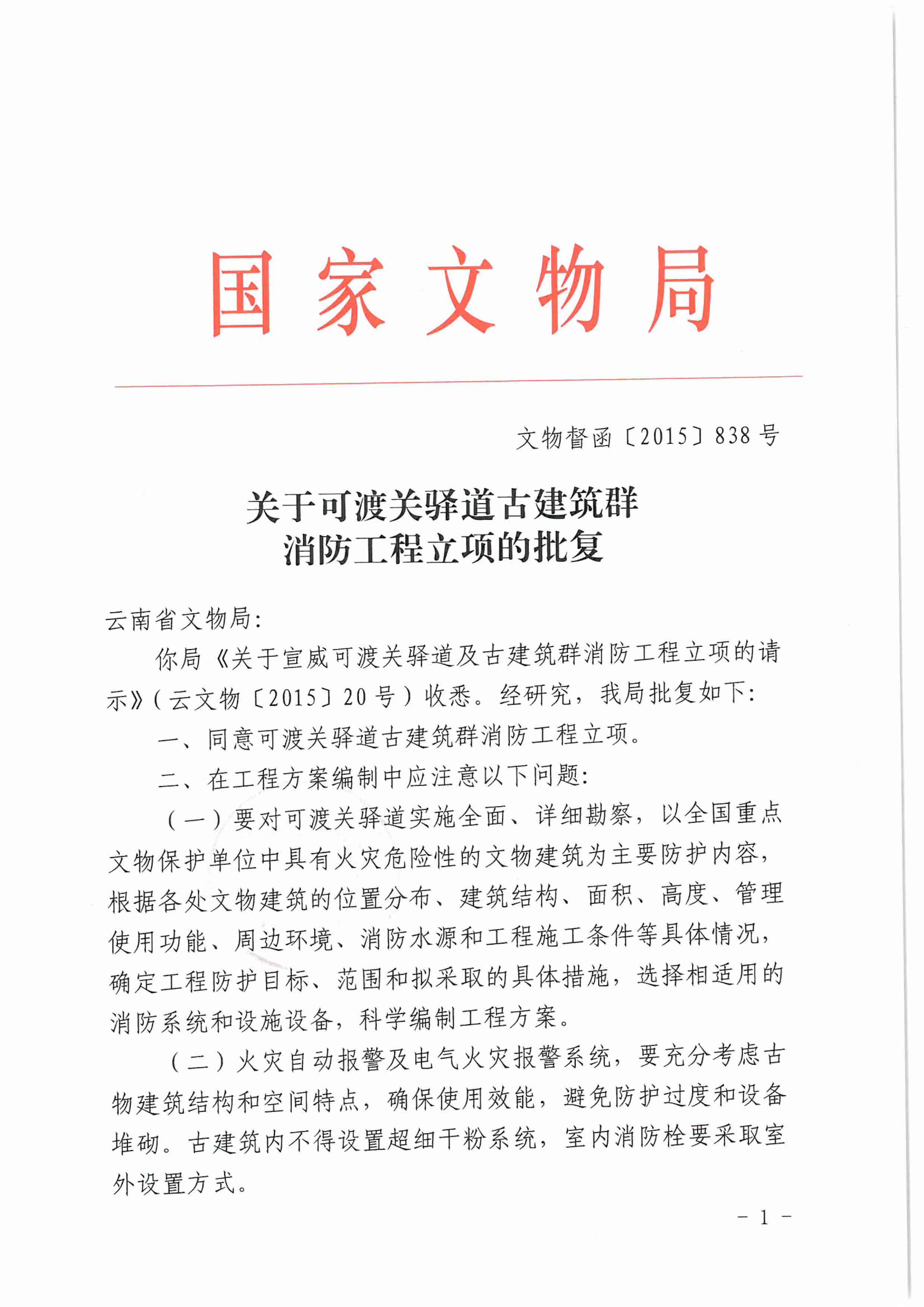 国家文物局关于可渡关驿道古建筑群消防工程立项的批复宣