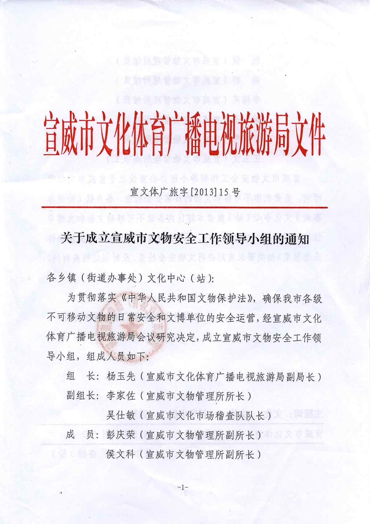 关于成立宣威市文物安全工作领导小组的通知