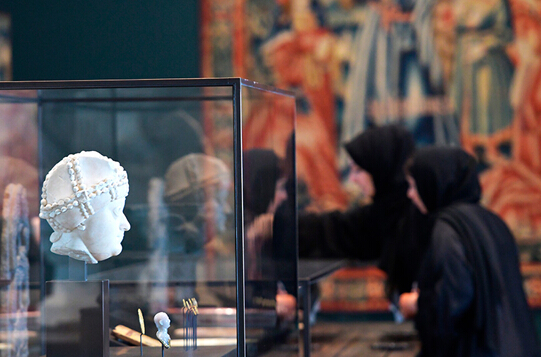 在阿联酋首都阿布扎比,美国抽象表现主义绘画大师杰克逊•波洛克 (Jackson Pollock) 和美国抽象派画家马克•罗斯科 (Mark Rothko) 与亨利•马蒂斯、荷兰后印象派画家文森特•梵高等名家杰作及美国杰出政治家乔治•华盛顿 (George Washington) 肖像在按时间顺序分为 12 个章节的展厅中公开展出。其他展厅专门用于展示来自中国、伊拉克及刚果民主共和国等国家和地区的文物,旨在讲述世界文明和宗教历史。图为 2017 年 11 月 6 日拍摄的资料图片,显示了在 11 月 8 日正式对外开放前的媒体参观期间,女性游客在位于阿联酋首都阿布扎比萨迪亚特岛的阿布扎比卢浮宫展厅中参观上展雕像。图片来源:法新社/朱塞佩。