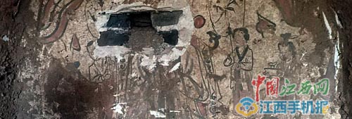 “刚发现古墓时,有不少砖散落在山上,不排除它被盗过。”据考古人员介绍,古墓规模很小,墓室长约2.2米,高约1.4米。但是令专家惊喜的是,墓室里竟然有保存完整、精美的壁画,经辨认,壁画上有太阳和星星模样的图案,四周还有栩栩如生的人物及动物图案。