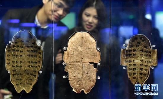 市民在位于河南省安阳市的殷墟博物馆中参观刻有甲骨文的卜甲(11月25日摄)。新华社发(李嘉南 摄)