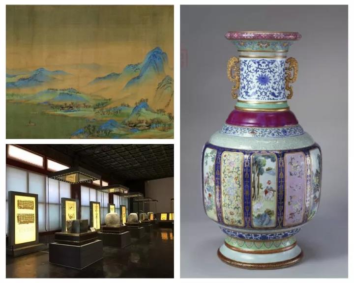 王希孟的《千里江山图》卷(左上)、石鼓(左下)、各种釉彩大瓶(右)