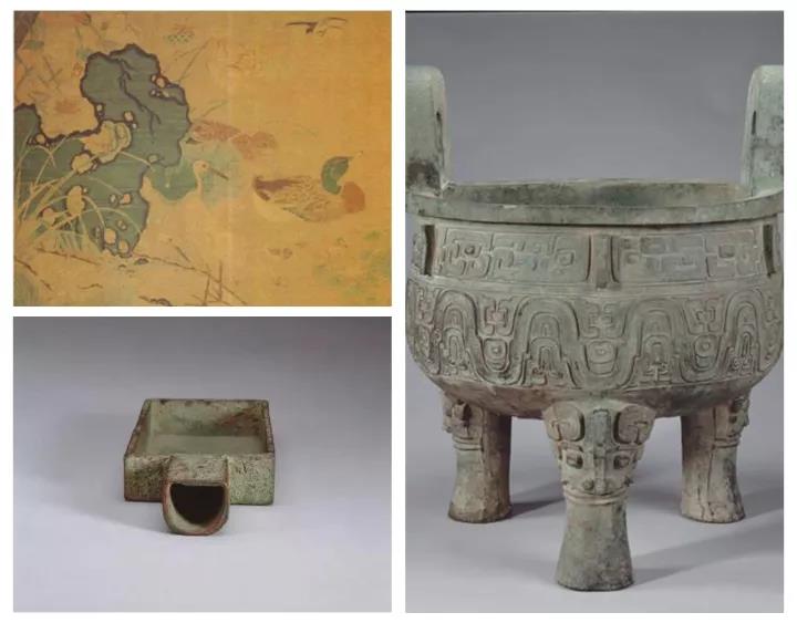 缂丝《莲塘乳鸭图》 宋代朱克柔(左上)、商鞅方升(左下)、大克鼎(右)