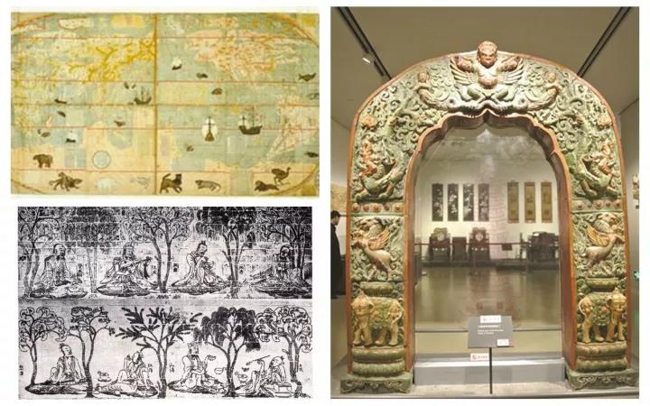 坤舆万国全图(左上)、竹林七贤与荣启期砖画(左下)、大报恩寺琉璃塔拱门(右)