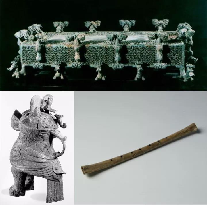 云纹铜禁(上)、妇好鴞尊(下左)、贾湖骨笛(下右)