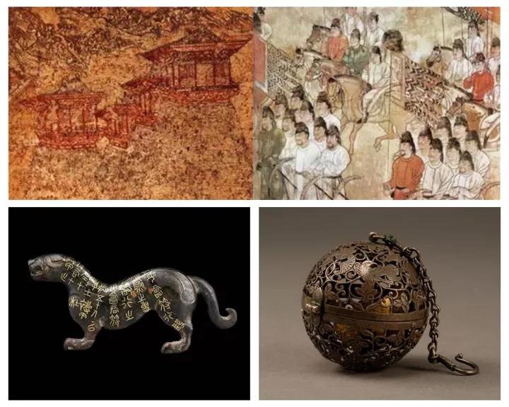 懿德太子墓壁画《阙楼仪仗图》(上)、杜虎符(左下)、葡萄花鸟纹银香囊(右下)